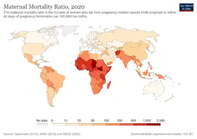 - ↑ Say, L; Chou, D; Gemmill, A; Tunçalp, Ö; Moller, AB; Daniels, J; Gülmezoglu, AM; Temmerman, M; Alkema, L (June 2014). "Global causes of maternal death: a WHO systematic analysis". The Lancet. Global Health. 2 (6): e323-33. doi:10.1016/S2214-109X(14)70227-X. PMID 25103301.
