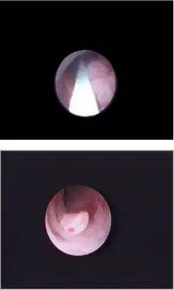 | A cystoscope showing a tumor in the ureters. Here it threatens to completely cut off flow to the ureters. | |