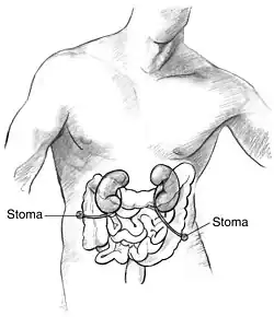 ![]() Human male with the ureters connected directly to the abdominal wall to create two stomas | |