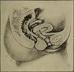| The diagnosis of ureterovaginal fistula has been known for some time (this illustration is from 1910) the location of the UV fistula is identified by the number five. | |