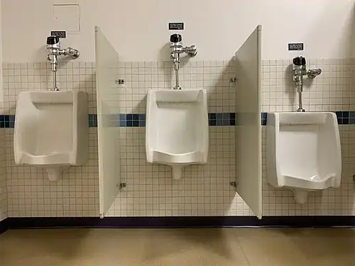 A urinal (US: /ˈjʊərənəl/, UK: /jʊəˈraɪnəl/)[1] is a sanitary plumbing fixture similar to a toilet, but for urination only. Urinals are often provided in male public restrooms in Western countries (less so in Muslim countries). They are usually used in a standing position. Urinals can be equipped with manual flushing, automatic flushing, or without flushing, as is the case for waterless urinals. They can be arranged as single sanitary fixtures (with or without privacy walls), or in a trough design without privacy walls.
