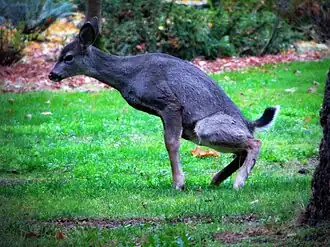 For land mammals over 1 kilogram, the duration of urination does not vary with body mass, being dispersed around an average of 21 seconds (standard deviation 13 seconds), despite a 4 order of magnitude (1000×) difference in bladder volume.[22][23] This is due to increased urethra length of large animals, which amplifies gravitational force (hence flow rate), and increased urethra width, which increases flow rate. For smaller mammals a different phenomenon occurs, where urine is discharged as droplets, and urination in smaller mammals, such as mice and rats, can occur in less than a second.[23] The posited benefits of faster voiding are decreased risk of predation (while voiding) and decreased risk of urinary tract infection.
