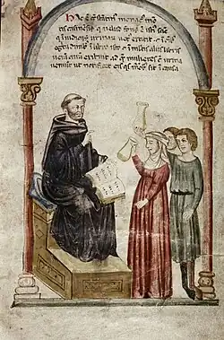 Painting showing the physician Constantine the African accepting urine samples for diagnosis