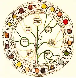 Physicians of antiquity interpreted the color of urine using circular charts listing correspondences with disease states. The relation of urine characteristics to disease was based on the theory of the four humors.[157] Different areas of the matula flask were thought to represent different organs and regions of the human body.[158] In the 16th century, Paracelsus applied the principles of alchemy to the study of urine.[159] He believed that materials obtained from distillation and precipitation of the urine could provide diagnostic information. In this respect he could be regarded as a progenitor of biochemical methods for urinalysis.[160]