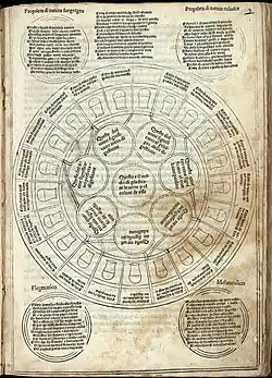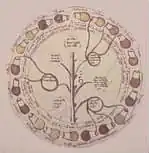 The uroscopy wheel is a diagram that linked the color of urine to a particular disease. It usually has twenty different uroscopy flasks with urine of different colors aligned around the border of the circle. Each flask has a line that connects it to a summary of a particular disease. This allowed doctors to have a quick reference guide to twenty different types of urine.[12]