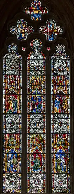 A uroscopy flask, also known as a "matula", is a piece of transparent glass with a thin neck at the top, and a small opening for the patient to urinate in. The bottle is known as a “maftul” in Arabic, which translates to “twisted” due to the shape of the flask’s neck. The translucent quality of the glass is imperative as colorations, along with any deformations, may lead to a misdiagnosis. The bladder-shaped vessel was introduced by Gilles de Corbeil and became a lasting symbol of uroscopy and general medical practice throughout the Middle Ages. Corbeil believed that different parts of the flask correlated to certain parts of the body.[1] Satirists, who mocked the practice for its intent focus on urine as a legitimate medical tool, mocked practitioners by evoking the symbol of the matula. For instance, images of monkeys conducting a uroscopic examination can be found in manuscript marginalia, as well as in an early 14th century stained glass window at York Minster Cathedral.[8]