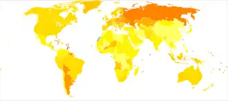 {{cite journal}}:|first1=has generic name (help)CS1 maint: numeric names: authors list (link) - ↑ 6.0 6.1 GBD 2015 Mortality and Causes of Death, Collaborators. (8 October 2016). "Global, regional, and national life expectancy, all-cause mortality, and cause-specific mortality for 249 causes of death, 1980–2015: a systematic analysis for the Global Burden of Disease Study 2015". Lancet. 388 (10053): 1459–1544. doi:10.1016/S0140-6736(16)31012-1. PMC 5388903. PMID 27733281.