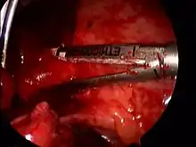 VATS lobectomy is the same as lobectomy performed via thoracotomy in that the pulmonary artery, pulmonary vein, and bronchus to the involved pulmonary lobe are individually dissected, ligated and divided. Generally, endoscopic stapling devices are used to ligate and divide the vessels and the bronchus however conventional suture material can also be used. During VATS lobectomy, the structures being operated on are not directly visualized with the naked eye but are visualized solely with a rigid thoracoscope. A camera attached to the thoracoscope transmits the image to a video screen, which allows surgeons and assistants to observe the flow of the operation. Surgical specimens are placed into a water-tight bag and removed from the chest without morcellization (i.e. breaking up the specimen into small pieces before removal); this prevents seeding of the VATS incisions with tumor cells and allows for an intact specimen for pathology examination and cancer staging. Removal of lymph nodes from the mediastinum is not compromised by VATS and remains a cornerstone of the surgical therapy of lung cancer. Visualization is enhanced due to the magnification afforded by the fiberoptic thoracoscope and a 30-degree angle of visualization aids in looking around corners. However, because the incisions are too small to allow passage of the surgeon's hands into the thorax, the surgeon's tactile input is compromised. VATS operations rely on a thorough understanding of pulmonary anatomy to allow for strategically placed incisions (usually 3–5 incisions total). The main advantages of VATS over thoracotomy are that major muscles of the chest wall are not divided and rib spreaders that can lead to rib fractures or costovertebral joint pain are not used. This results in a hospital length of stay after VATS lobectomy generally reported to range from 3–5 days,[4] or roughly half that for lobectomy via thoracotomy.