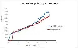 V̇O2 max (also maximal oxygen consumption, maximal oxygen uptake or maximal aerobic capacity) is the maximum rate of oxygen consumption attainable during physical exertion.[1][2] The name is derived from three abbreviations: "V̇" for volume (the dot over the V indicates "per unit of time" in Newton's notation), "O2" for oxygen, and "max" for maximum and usually normalized per kilogram of body mass. A similar measure is V̇O2 peak (peak oxygen consumption), which is the highest rate attained during a session of submaximal physical exercise. It is equal to, or less than, the V̇O2 max. Confusion between these quantities in older and popular fitness literature is common.[3] The capacity of the lung to exchange oxygen and carbon dioxide is constrained by the rate of blood oxygen transport to active tissue.