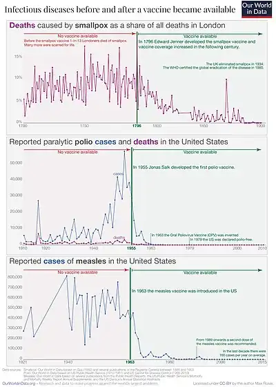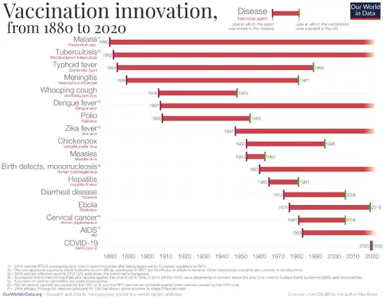 - ↑ Roser, Max; Vanderslott, Samantha (2013-05-10). "Vaccination". Our World in Data. Archived from the original on 2020-09-01. Retrieved 2022-11-13.