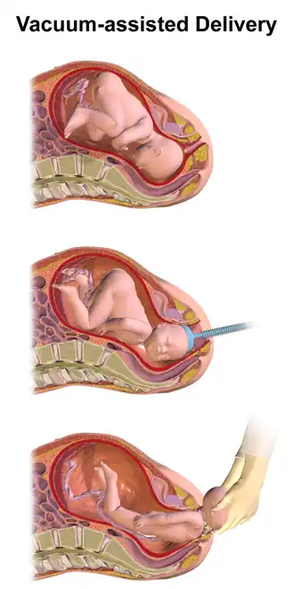 • An assisted vaginal delivery (AVD) or instrumental vaginal delivery occurs when a pregnant woman requires the use of special instruments such as forceps or a vacuum extractor to deliver her baby vaginally.[12] It is usually performed when the pregnancy does not progress during the second stage of labor. If the goal is to avoid the adverse effects of pushing that a cardiac patient may experience, it may also be performed in this case.[13] Both spontaneous and induced vaginal delivery can be assisted. Examples of instruments to assist delivery include obstretical forceps and vacuum extraction with a vacuum cup device.[12]