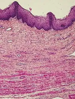 ![]() The epithelium of the vagina, visible at top, consists of multiple layers of flat cells. | |