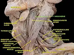 The right and left vagus nerves descend from the cranial vault through the jugular foramina,[5] penetrating the carotid sheath between the internal and external carotid arteries, then passing posterolateral to the common carotid artery. The cell bodies of visceral afferent fibers of the vagus nerve are located bilaterally in the inferior ganglion of the vagus nerve (nodose ganglia).The vagus runs parallel to the common carotid artery and internal jugular vein inside the carotid sheath.
