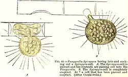 • Prey infiltration. Similarly to protoplast extractors, they perforate the cell wall of an algal prey, but invade the cell itself and completes the cycle within it. Some are able to move laterally from one cell to the next in filamentous prey. They divide into smaller portions that turn into digestive cysts.[3]