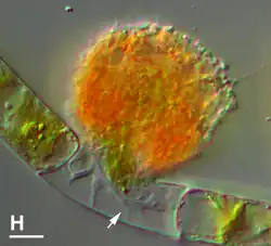 Vampyrella lateritia extracting algal cell content with a pseudopodium (arrow)