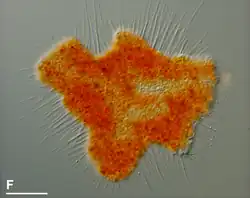 • Filoflabellate morphotype, only found in Placopus, with flattened elliptical, spherical or fan-shaped cells that exhibit a clear separation between the granuloplasmic cell hump and the hyaloplasmic lamellae, sometimes called 'lamellipodia'. There are numerous filopodia on the ventral side of the cell. Some of these trophozoites resemble amoebozoans such as vannellids, except for the presence of filopodia. They move by rolling over the filopodia that are anchored to the substrate.[3]