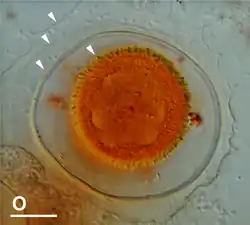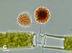 • The immobile but highly metabolically active 'digestive cyst' stage, that appears after the feeding. In some species it is called a 'resting phase', but it is different from a true resting cyst (or spore) that is metabollically inactive to survive adverse conditions. To reach this stage, the trophozoite retracts its filopodia, secretes a layered cell wall, and strongly attaches itself to the substrate or floats freely. Either a central main vacuole or multiple separate vacuoles appear to digest the food. The cytoplasm color may change to a bright red, orange or yellow color, or remain colorless. When the digestive phase is finished, one or multiple trophozoites hatch from the cyst through holes in the cell wall.[3]