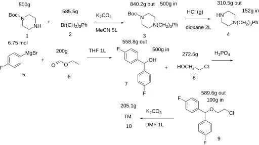 Reaction of 1-Boc-piperazine (1) and (3-bromopropyl)benzene (2) gives (3) which, after removal of the Boc group using acid gives 1-(3-phenylpropyl)piperazine (4). Separately, a Grignard reaction using two equivalents of 4-fluorophenylmagnesium bromide (5) with ethyl formate (6) results in the formation of bis(4-fluorophenyl)methanol (7). Ether formation with 2-chloroethanol (8) in the presence of phosphoric acid gives the second alkylation partner (9). This is combined with (4) in a convergent synthesis to yield vanoxerine.[21][22]
