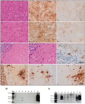 - ↑ Zou, W.; Puoti, G.; Xiao, X.; Yuan, J.; Qing, L.; Cali, I.; Shimoji, M.; Langeveld, J.; Castellani, R.; Notari, S.; Crain, B.; Schmidt, R. E.; Geschwind, M.; Dearmond, S. J.; Cairns, N. J.; Dickson, D.; Honig, L.; Torres, J. M.; Mastrianni, J.; Capellari, S.; Giaccone, G.; Belay, E. D.; Schonberger, L. B.; Cohen, M.; Perry, G.; Kong, Q.; Parchi, P.; Tagliavini, F.; Gambetti, P. (2010). "Variably protease-sensitive prionopathy: A new sporadic disease of the prion protein". Annals of Neurology. 68 (2): 162–172. doi:10.1002/ana.22094. PMC 3032610. PMID 20695009.