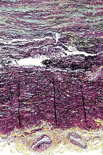 ![]() Micrograph showing cystic medial degeneration. The tunica adventitia (also called tunica externia; yellow at bottom of image) with vaso vasorum is also seen. Movat's stain. | |