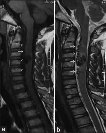 - ↑ Latin: myelitis transversa & the disorder's name is derived from Greek myelós referring to the "spinal cord", and the suffix -itis, which denotes inflammation.[1]