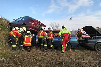 Vehicle extrication is the process of removing a patient from a vehicle which has been involved in a motor vehicle collision.[1] Patients who have not already exited a crashed vehicle may be medically (cannot exit a vehicle due to their injuries) or physically trapped,[2] or unable to exit the vehicle because a door will not open.