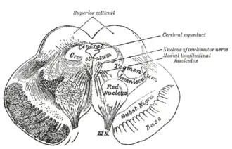 ![]() Transverse section of mid-brain at level of superior colliculi. (Tegmentum labeled at center right.) | |