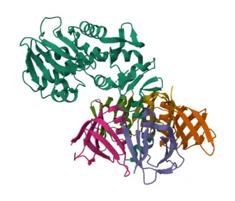 Ribbon diagram of Shiga toxin (Stx) from S. dysenteriae. From PDB: 1R4Q.