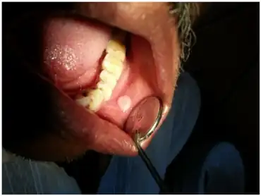 | Clinical photograph showing the exophytic lesion on the left buccal mucosa. | |