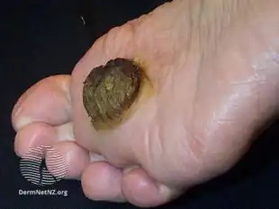 Epithelioma cuniculatum (also known as Carcinoma cuniculatum,[11]: 654 and Ackerman tumor[12]) is a subtype of verrucous carcinoma,[13] characterized by well-differentiated epithelial cells which lack cytological atypia, but display a blunt papillary/pebbly surface and keratin-filled crypts extending deep into the connective tissue.[14] These keratin-filled resemble rabbit burrows.[14] It is located almost exclusively on the foot,[13] but at least oral location has also been described.[14]