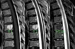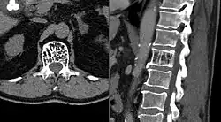 - ↑ Cloran FJ, Pukenas BA, Loevner LA, Aquino C, Schuster J, Mohan S (2015). "Aggressive spinal haemangiomas: imaging correlates to clinical presentation with analysis of treatment algorithm and clinical outcomes". The British Journal of Radiology. 88 (1055) 20140771. doi:10.1259/bjr.20140771. PMC 4743441. PMID 26313498.