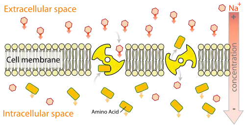 The active transport of monoamines from the cytosol into storage vesicles operates against a large (>105) concentration gradient. Secondary active transport is the type of active transport used, meaning that VMAT1 is an antiporter. This transport is facilitated via proton gradient generated by the protein proton ATPase. The inward transport of the monoamine is coupled with the efflux of two protons per monoamine.[12] The first proton is thought to cause a change in VMAT1's conformation, which pushes a high affinity amine binding site, to which the monoamine attaches. The second proton then causes a second change in the conformation which pulls the monoamine into the vesicle and greatly reduces the affinity of the binding site for amines. A series of tests suggest that His419, located between TMDs X and XI, plays the key role in the first of these conformational changes, and that Asp431, located on TMD XI, does likewise during the second change.[9]