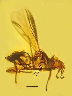- ↑ Cerretti, P; Stireman, JO III; Pape, T; O'Hara, JE; Marinho, MAT; Rognes, K; Grimaldi, DA (2017). "First fossil of an oestroid fly (Diptera: Calyptratae: Oestroidea) and the dating of oestroid divergences". PLOS ONE. 12 (8) e0182101. Bibcode:2017PLoSO..1282101C. doi:10.1371/journal.pone.0182101. PMC 5568141. PMID 28832610.