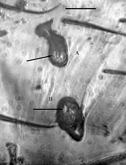 Both the oocysts are a brown in coloration and are between 29–32 μm (0.001–0.001 in) long by 15–17 μm (0.001–0.001 in) wide. Both oocysts have a thin surrounding membrane, multiple dark colored cells with nuclei and a number of developing sporozoites. The sporozoites in the oocysts range between 7–10 μm (0.000–0.000 in), while the sporocytes in the salivary glands are slightly larger, 8–10 μm (0.000–0.000 in) and have a rounded stubby outline.[1]