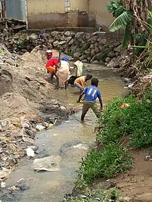 V. cholerae can cause syndromes ranging from asymptomatic to cholera gravis.[16] In endemic areas, 75% of cases are asymptomatic, 20% are mild to moderate, and 2-5% are severe forms such as cholera gravis.[16] Symptoms include abrupt onset of watery diarrhea (a grey and cloudy liquid), occasional vomiting, and abdominal cramps.[1][16] Dehydration ensues, with symptoms and signs such as thirst, dry mucous membranes, decreased skin turgor, sunken eyes, hypotension, weak or absent radial pulse, tachycardia, tachypnea, hoarse voice, oliguria, cramps, kidney failure, seizures, somnolence, coma, and death.[1] Death due to dehydration can occur in a few hours to days in untreated children. The disease is also particularly dangerous for pregnant women and their fetuses during late pregnancy, as it may cause premature labor and fetal death.[16][17][18] A study done by the Centers for Disease Control (CDC) in Haiti found that in pregnant women who contracted the disease, 16% of 900 women had fetal death. Risk factors for these deaths include: third trimester, younger maternal age, severe dehydration, and vomiting[19] Dehydration poses the biggest health risk to pregnant women in countries that there are high rates of cholera. In cases of cholera gravis involving severe dehydration, up to 60% of patients can die; however, less than 1% of cases treated with rehydration therapy are fatal. The disease typically lasts 4–6 days.[16][20] Worldwide, diarrhoeal disease, caused by cholera and many other pathogens, is the second-leading cause of death for children under the age of 5 and at least 120,000 deaths are estimated to be caused by cholera each year.[21][22] In 2002, the WHO deemed that the case fatality ratio for cholera was about 3.95%.[16]