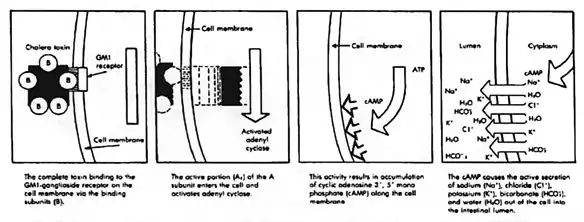 During infection, V. cholerae secretes cholera toxin (CT), a protein that causes profuse, watery diarrhea (known as "rice-water stool").[12][5] This cholera toxin contains 5 B subunits that plays a role in attaching to the intestinal epithelial cells and 1 A subunit that plays a role in toxin activity. Colonization of the small intestine also requires the toxin coregulated pilus (TCP), a thin, flexible, filamentous appendage on the surface of bacterial cells. Expression of both CT and TCP is mediated by two component systems (TCS), which typically consist of a membrane-bound histidine kinase and an intracellular response element.[13] TCS enable bacteria to respond to changing environments.[13] In V. cholerae several TCS have been identified to be important in colonization, biofilm production and virulence.[13] Quorum regulatory small RNAs (Qrr RNA) have been identified as targets of V. cholerae TCS.[13][14][15] Here, the small RNA (sRNA) molecules bind to mRNA to block translation or induce degradation of inhibitors of expression of virulence or colonization genes.[13][14] In V. cholerae the TCS EnvZ/OmpR alters gene expression via the sRNA coaR in response to changes in osmolarity and pH. An important target of coaR is tcpI, which negatively regulates expression of the major subunit of the TCP encoding gene (tcpA). When tcpI is bound by coaR it is no longer able to repress expression tcpA, leading to an increased colonization ability.[13] Expression of coaR is upregulated by EnvZ/OmpR at a pH of 6,5, which is the normal pH of the intestinal lumen, but is low at higher pH values.[13] V. cholerae in the intestinal lumen utilizes the TCP to attach to the intestinal mucosa, not invading the mucosa.[13] After doing so it secretes cholerae toxin causing its symptoms. This then increases cyclic AMP or cAMP by binding (cholerae toxin) to adenylyl cyclase activating the GS pathway which leads to efflux of water and sodium into the intestinal lumen causing watery stools or rice watery stools.