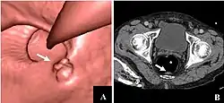 ![]() CT colonography of a rectal mass. Left image is a volume rendering and right image is a thin slice. It also shows the rectal tube used for insufflation of gas to distend the colon. | |