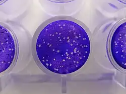 - ↑ Baer, Alan; Kehn-Hall, Kylene (November 4, 2014). "Viral Concentration Determination Through Plaque Assays: Using Traditional and Novel Overlay Systems". Journal of Visualized Experiments (93) e52065. doi:10.3791/52065. PMC 4255882. PMID 25407402.