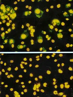 - ↑ Rimmelzwaan, G.F.; Baars, M.; Claas, E.C.J.; Osterhaus, A.D.M.E. (1998). "Comparison of RNA Hybridization, Hemaaglutination Assay, Titration of Infectious Virus and Immunofluorescence as Methods for Monitoring Influenza Virus Replication In Vitro". Journal of Virological Methods. 74 (1): 57–66. doi:10.1016/S0166-0934(98)00071-8. PMID 9763129.