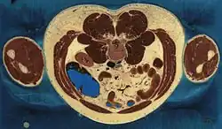 The Visible Human Project is an effort to create a detailed data set of cross-sectional photographs of the human body, in order to facilitate anatomy visualization applications. It is used as a tool for the progression of medical findings, in which these findings link anatomy to its audiences.[1] A male and a female cadaver were cut into thin slices, which were then photographed and digitized. The project is run by the U.S. National Library of Medicine (NLM) under the direction of Michael J. Ackerman. Planning began in 1986;[2] the data set of the male was completed in November 1994 and that of the female in November 1995. The project can be viewed today at the NLM in Bethesda, Maryland.[3] There are currently efforts to repeat this project with higher resolution images but only with parts of the body instead of a cadaver.