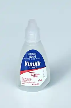 Visine (/ˌvaɪˈziːn/), also known as Vispring, is a brand of eye drops produced by Kenvue.[1] Visine was first introduced in 1958 and was acquired by Pfizer in 1999.[2][3] In 2006, Johnson & Johnson acquired Visine, along with Pfizer's entire consumer healthcare portfolio.[4] The original formulation of Visine includes the active ingredient tetrahydrozoline hydrochloride, which is a vasoconstrictor that constricts the eye's superficial blood vessels to temporarily reduce eye redness.[5]