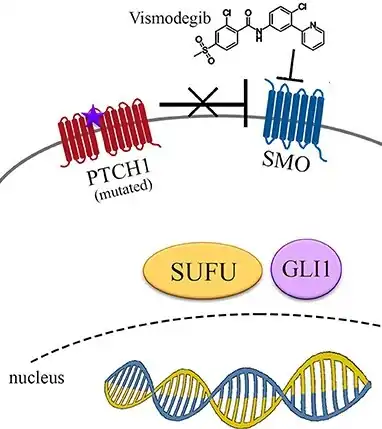 SMO inhibition causes the transcription factors GLI1 and GLI2 to remain inactive, which prevents the expression of tumor mediating genes within the hedgehog pathway.[10]