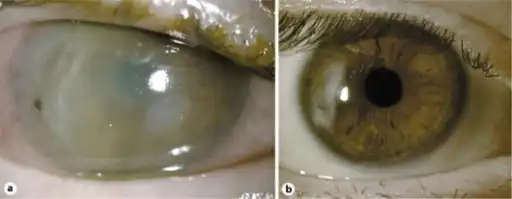 a) Cornea with temporal perforation, opacified stroma b) after vitamin A therapy.