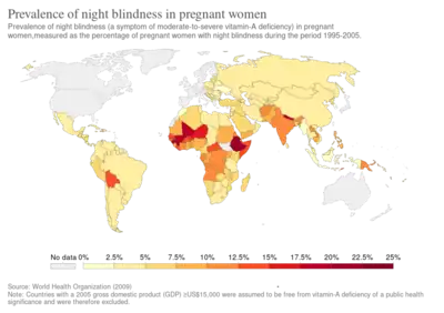 VAD is common in developing countries, particularly those in Africa and South-East Asia; however, it is rare in developed countries.[1] About 190 million children under five and 19 million pregnant women are estimated to be affected.[2] About 250,000–500,000 children in developing countries become blind each year as a result, making it the leading cause of preventable childhood blindness.[2][1] Among those who become blind, about half die within a year.[2] It is particularly common in the later part of pregnancy, and results in poor outcomes both for the mother and baby.[2][1]