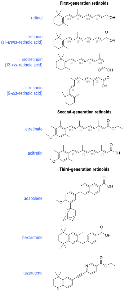 - First generation include retinol, retinal, tretinoin (retinoic acid), isotretinoin, and alitretinoin