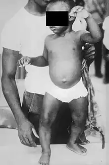 Although rickets and osteomalacia are now rare in Britain, osteomalacia outbreaks in some immigrant communities included women with seemingly adequate daylight outdoor exposure wearing typical Western clothing.[31] Having darker skin and reduced exposure to sunshine did not produce rickets unless the diet deviated from a Western omnivore pattern characterized by high intakes of meat, fish, and eggs, and low intakes of high-extraction cereals.[32][33][34] In sunny countries where rickets occurs among older toddlers and children, vitamin D deficiency has been attributed to low dietary calcium intakes. This is characteristic of cereal-based diets with limited access to dairy products.[34] Rickets was formerly a major public health problem among the US population; in Denver, where ultraviolet rays are about 20% stronger than at sea level on the same latitude,[35] almost two-thirds of 500 children had mild rickets in the late 1920s.[36] An increase in the proportion of animal protein in the 20th-century American diet coupled with increased consumption of milk fortified with relatively small quantities of vitamin D coincided with a dramatic decline in the number of rickets cases.[37][38][39] One study of children in a hospital in Uganda however showed no significant difference in vitamin D levels of malnourished children compared to non-malnourished children. Because both groups were at risk due to darker skin pigmentation, both groups had vitamin D deficiency. Nutritional status did not appear to play a role in this study.[40]