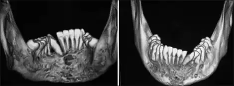 CT scan image showing severe mandibular radiolucency and alveolar bone resorption
