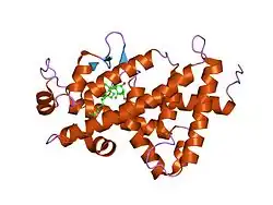 The vitamin D receptor (VDR also known as the calcitriol receptor) is a member of the nuclear receptor family of transcription factors.[5] Calcitriol (the active form of vitamin D, 1,25-(OH)2vitamin D3) binds to VDR, which then forms a heterodimer with the retinoid-X receptor. The VDR heterodimer then enters the nucleus and binds to Vitamin D responsive elements (VDRE) in genomic DNA. VDR binding results in expression or transrepression of many specific gene products. VDR is also involved in microRNA-directed post transcriptional mechanisms.[6] In humans, the vitamin D receptor is encoded by the VDR gene located on chromosome 12q13.11.[7]