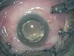Lensectomy – In some cases, a lensectomy, or "cataract surgery", is done in conjunction with the vitrectomy. This extra procedure is performed when the lens of eye is cloudy (cataract), damaged during the vitrectomy, if there is attached to scar tissue, or if the pressure in the eye needs to be lowered (as in the case with some glaucomatous patients).[7]