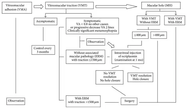 An experimental test of injections of perfluoropropane (C3F8) on 15 symptomatic eyes of 14 patients showed that vitreomacular traction resolved in 6 eyes within 1 month and resolved in 3 more eyes within 6 months.[19] A systematic review found high-certainty evidence that Ocriplasmin compared to no treatment increases the chance of resolution and improves vision in people with symptomatic VMA. [20] Ocriplasmin probably reduces the need for surgery but there were more adverse events in eyes treated with ocriplasmin compared to control.